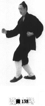 2.上动不停。身体左转,左手呈压掌带回腰间.右手变拳,随身左转,重心在右(图138)