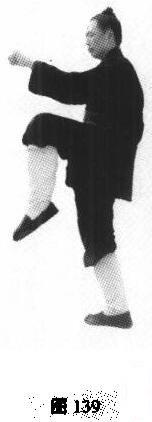 动作:身体右转,右手由拳变掌,随右转,翻腕,变压带掌,收回右腰,左手与左脚同动,左手屈肘,向上用拳背击顶,同时左膝提起(图139)