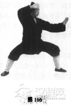 动作:接上式。左腿渐下蹲,右脚落地于原处,两掌随转体向左后摆,右臂随着外旋,掌心朝上翻,屈肘架于头上,左手向左前方推出,高与肩平.眼神关及左掌打击(图166)