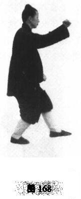 2.左朝阳。右脚渐实,主承重心,微坐屈膝,右手变拳沿弧形向下往里压回腹前,同时腰身右转,左手与左脚同动.左手由下往上内旋翻掌变拳划弧击出,与转身同时至左侧头前,拳与眉高,拳眼向里,左脚经右踩外侧向右前方划弧迈出,距尺许处,虚脚着地(图168).