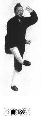 1.独立抱球上动不停。重心移至左脚,身体前移直起略向左转,右手与右脚随身左转时,右脚提起呈左脚独立式,左手与右手在胸前划立圆,交叉过后,右手在下腹前,掌心朝上,左手在头前,两掌心相对,呈抱球形(图169)