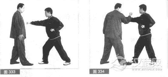(2)对方前冲力较大,拳势猛.我稍缩胸躲闪其拳击打;同时,用右肘向左揉动滚磕对方右拳,迫其向左偏离我身体。(图334)