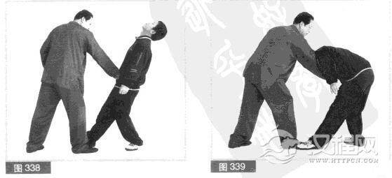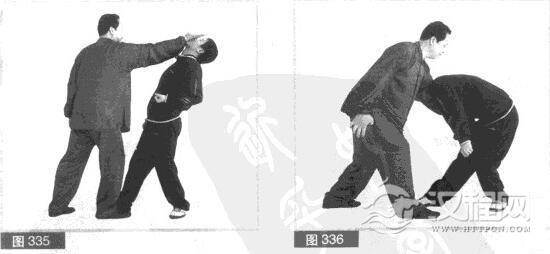 (4)对方速向后仰头躲闪我拍打,同时用左拳向上迎架我右手。趁对方下身前突之际,我用左手快速向前撩抓对方档部。(图336)