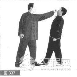 (1)对方右前势对我。我抢先发打,左脚向前上步.左拳同时向前直打对方头部。(图337)