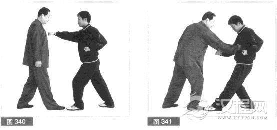 (4)对方急用左拳向下磕砸我右拳,同时.用右拳向前击打我腹部。(图340)