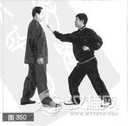 (1)双方右前势对峙。对方用右拳向前、向上援击我下领部位。(图350)