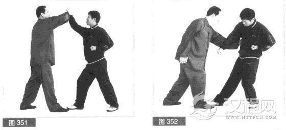 (2)我后仰头躲对方擂打.同时右拳向上托架对方右拳。(图351)