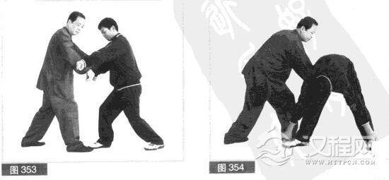 (5)对方连连进攻,右拳向又前击打我头部。我头向左躲闪.右脚向左前方上一步.左脚跟步.身体跟进,与此同时.用右拳向前撩打对方档部。(图354)