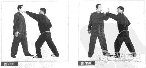 (2)我上身微右转,同时用左拳向左、向后谧挂对方左拳腕。(图356)