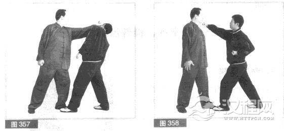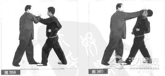(5)我上身微左转.右拳同时向右、向后硫挂对方右拳腕。(图359)