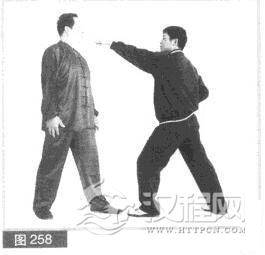 (1)我左前势对敌。对方抢先发招,出左拳向前直打我头部,左脚同时前上步。(图258)