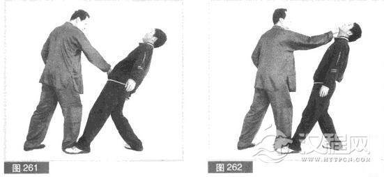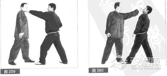 (3)我连防带打.闪对方拳打的同时,利用对方身体前冲之力,用左拳向前快速迎打对方脸部。(图260)