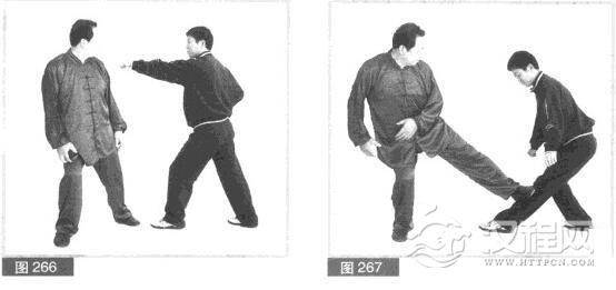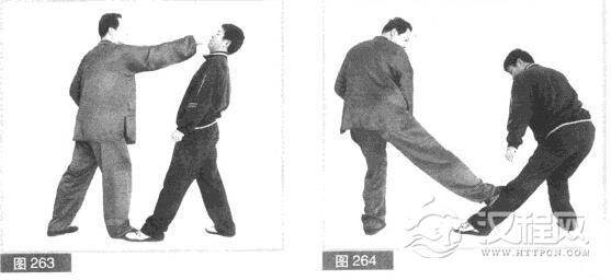(2)不管右拳击打的结果如何,我左脚向前跳一小步.右脚同时跳起,向前跺踹对方左小腿迎面骨。(图264)