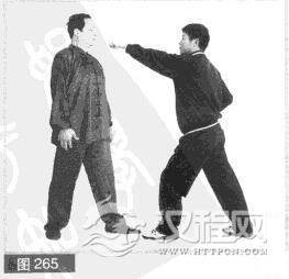 (2)我右脚向右前方快速跳一小步,身体跟进,躲对方左拳击打。(图266)