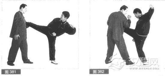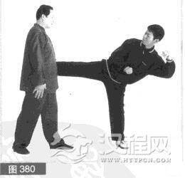 (1)我左前势对敌.对方左脚向上抢步后,用右边腿扫踢我腰部。(图380)