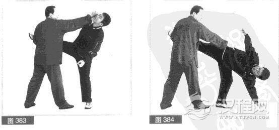 (4)对方欲用双手抱我脖子.我疾攻连打。动在敌前.用右拳向前击打对方头部。(图383)