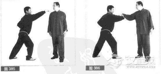 (2)我身体微右转.并速用右手向右、向下抄持缠抓对方右小臂,防其击打找头。(图386)