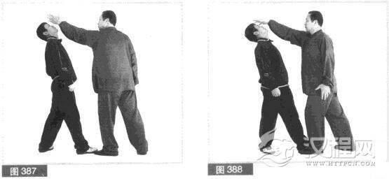 (4)对方急向后抽右臂迎挡我左拳.右脚同时后撤步,并用左拳向前击打我腹部。我连打疾进,右手后发先至,在对方左拳击出未达之际.向前、向下盖击对方头顶部位。(图388)