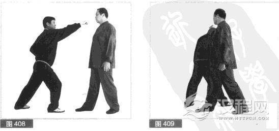 (1)我右前势对敌。对方右脚向前上步,同时出右拳向前直打我头部。(图408)