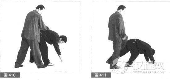 (3)对方速前俯身闪过我拳打,同时用右拳向右后方击打我右肋部位。我左脚快速向前上步.身体右转.在躲闪对方右拳击打的同时,双手成掌,用掌根部位一起向下确击对方背部。(图410)