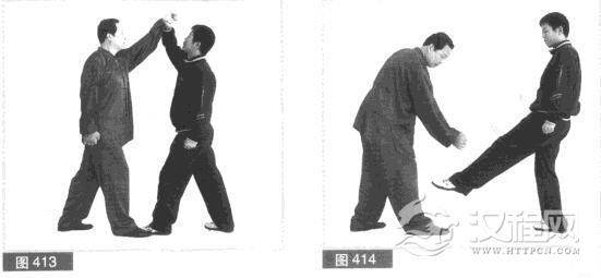 (2)对方速用右拳向上迎架我左拳.并稍向后闪,防我击打。(图413)