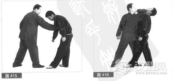 (4)我打攻结合.右拳向下硕击对方左脚后不停.即向前直打对方胸口部位。(图415)