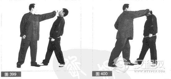 (2)对方头快速向左躲闪,避开我左拳击打。我连续击打,右拳即向前、向左横打对方左脑部位。(图400)