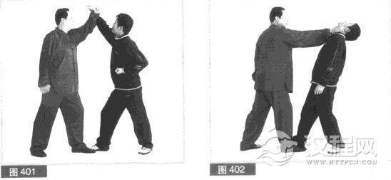 (4)紧接不停,我右脚快速向前上步,右手同时向前卡抓对方喉脖部位。(图402)