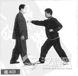 (1)我右前势对敌。对方上右步,出右拳向前直击我胸部。(图403)
