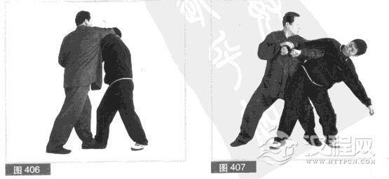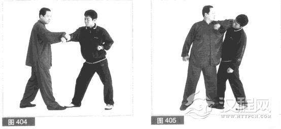 (2)我右手快速向上、向右抄持缠抓对方右小臂。(图404)