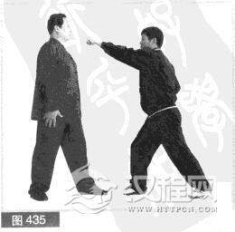 (1)我左前势对敌。对方右脚上步,出左拳向前击打我头部。(图435)