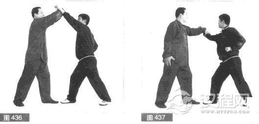 (3)对方连拳击打.即用右拳向前再打我头部。我左手成掌,向上、向左抄捋缠抓对方右小臂.防开对方击打。(图437)