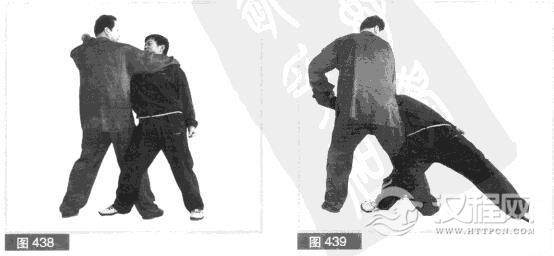 (5)紧接不停,在对方欲挺身抽臂之际,我左手抓紧对方右臂向左后方将拽,右臂抱紧对方脖子.右腿拗住对方右腿.向左拧腰甩胯,将对方摔倒于地。(图439)