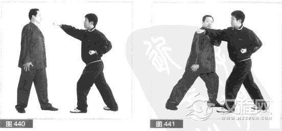 (2)对方拳式凶猛,我避其锋芒.头向左闪.左脚向左前方上步.用左手向右推击对方右小臂,使对方右拳落空。(图441)