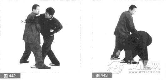 (4)紧接不停,我上身前俯,重心右移,用右肩向右靠击对方右肩肋部位,使对方向左倒于地上。(图443)
