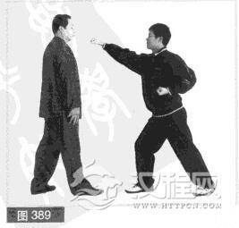 (1)我右前势对敌。对方右脚向前上步.同时右拳向前击打我头部。(图389)