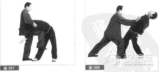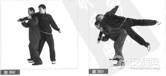 (4)紧接不停。我身体快速右转,背部贴紧对方右肋部位,用左肩顶住对方右大臂臂根部位,用左手向下抓住对方右大竹。(图392)