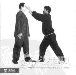 (1)我左前势对敌,对方抢攻猛打.右脚抢步向前,同时,双手成掌,掌心朝上,用掌根部位向前、向里(左掌向右、右掌向左)砍击我头部。(图394)