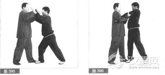 (3)紧接不停,在对方欲向回抽右臂之际.我动在敌前,左脚速向前上步,落至对方右脚左侧。(图391)