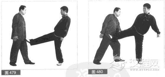 (1)我左前势对敌。对方抢攻先打,左脚向前落步.提右腿用右脚向前弹踢我小腹部位。(图479)