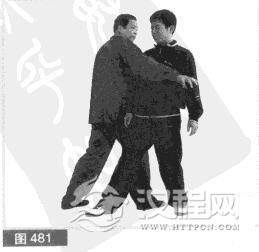 (3)紧接不停.我右脚快速向前上步,落至对方身体右后方。(图481)