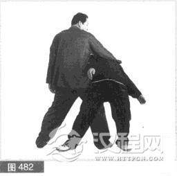 (4)紧接不停,与右脚落步同时,我用右臂抱住对方脖子,并快速向左拧腰甩胯,将对方掉倒地上。(482)