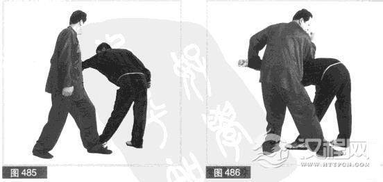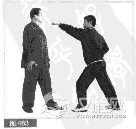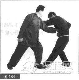(3)对方急缩身化我拳力.同时用左拳向左反打我头部。我左手成掌向上、向左缠抓对方左小臂。(图485)