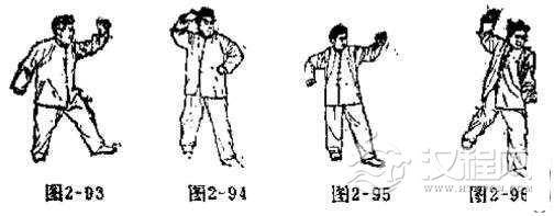 下身姿势与头撞法的练法相同。上身姿势是左臂迎面伸出,略有弯曲,左手作半握拳状,护住面部。右小臂提起,与右肩约成90度角,拳眼向上前方。左拳由上往回往下做环形动作。右拳随之由下往上住回做环形动作。做此动作之时,要以两肩带动两肘,以两肘带动两拳,两臂如两轮旋转,无断续处(如图2-93, 2-94, 2-95,2-96).