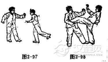 对方用左脚向我右肋踢来时,我可用下撩锤以迎击。当对方左脚将要接近我右肋时,我身形略向左闪,左小臂回转,护住前胸部位。以右小臂肘弯由下往上,猛力撩挑对左腿的腿弯部位,使对方身形后仰,向后翻倒。其它动作要领与下撩锤的练法相同(如图2-97, 2-98)。