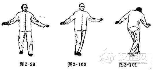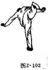 下身姿势与头撞法的练法相同。上身姿势是两待左右分开,略有弯曲,两臂与自身约成45度角,两手十指自然分开,手心向下,身形中正、周身放松。左脚后退一步,以左脚掌为轴,自身由右向左旋转180度角,上身姿势不变,趁势腰向前弯成90度角,抬头挺胸,往左扭项,以左眼余光后望,右脚(或左脚)平直后蹬,与上身基本形成平角。此是败中取胜的用腿方法(如图2一99、2—00, 2-101、2一102).