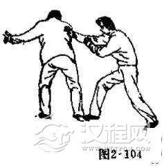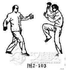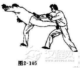 对方用双手向我面部扑打,同时以右脚下踢我小腹部部位,我可用后蹬脚以迎击。当对方手脚齐发将要接近我面部和小腹之时,我左脚后撤一步,使对方手脚落空之际,后转回身抬左脚(或右脚)平直猛力后蹬对方。(或用脚后跟上撩对方亦可)其他动作要领与后蹬脚的练法相同。(如图2-103, 2一104, 2-105)