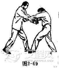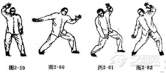 下身姿势与头撞法的练法相同。上身姿势是右小臂弯曲,右肘外撑,右手五指自然分开,手心向外,护住头部右侧,含脚拔背,下蹲右腿,左腿向前伸直,塌腰矮身。左手五指亦自然分开,由自身小腹部位,顺着自己左腿内侧,向下前方往上作孤形动作,身形随之上起,成左腿在前的弓蹬步姿势。左手上穿至头部上前方,左小臂略有弯曲,手心向右,指尖向上.此属于大成拳中的摔法之一(如图2-59,2-60, 2-61, 2-62)。