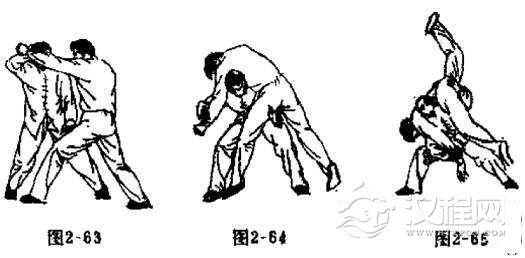 对方用左摆拳向我头部右侧击来时,.我可用穿裆手迎击。当对手左摆拳将要接近我头部时,我用右小臂格挡对方左小臂。顺势将对方左小臂(或腕部)抓住。我身形随之下蹲,进左步,以左小臂穿入对方裆内,曲肘上挑,身形随之上长。右手同时向自身背后下拉,将对方扛起。其它动作要领与穿档手的练法相同(如图2-63, 2-64, 2-65)