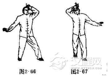 下身姿势与头撞法的练法相同。上身姿势是两小臂弯曲,两肘外撑。两腋半虚,十指自然分开,指尖基本相对,手心向下,两手左右距离略宽于肩,两手与自身胸部距离,最远不超过5拳,最近不可贴于胸部。左手由左外侧向左内侧,由上往下做环形动作。右手随之由右外侧向右内侧,由上往下作环形动作。两手如此作交替的环形运动(如图2-66,2-67)。